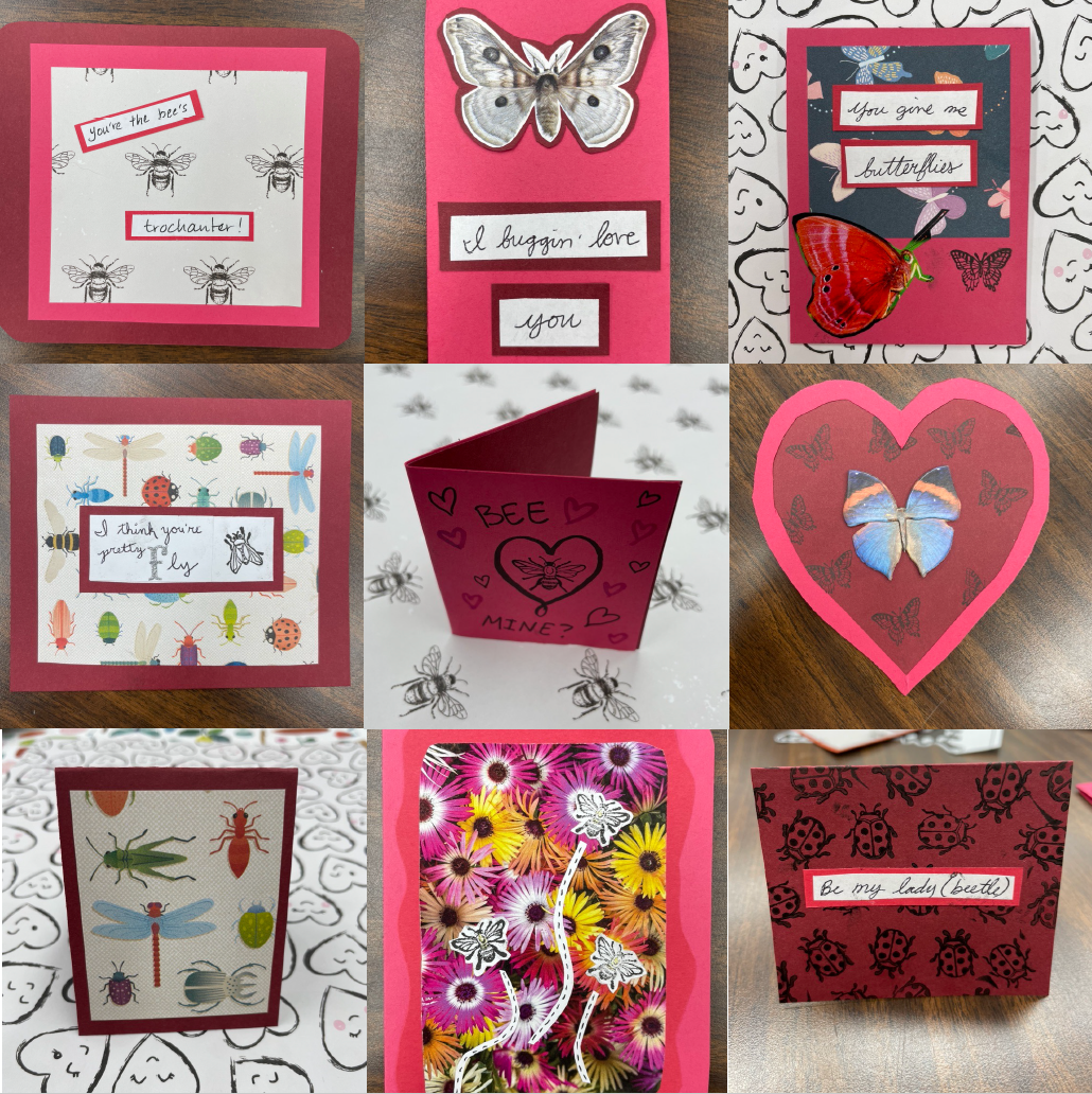 In December, PJ Liesch led a workshop on the topic of talking to the media. As usual, Hanna forgot to record the workshop, but you can see PJ’s very informative slides here. Matt also hosted a department-wide Game Night in December. In February, Jade Kochanski hosted Bug Valentine making. It was so fun to take a break from our work to craft together, catch up in person, and connect over entomological valentine puns! We’re looking forward to more ento-crafting together soon. A few more events for spring are in the works, so stay tuned!
