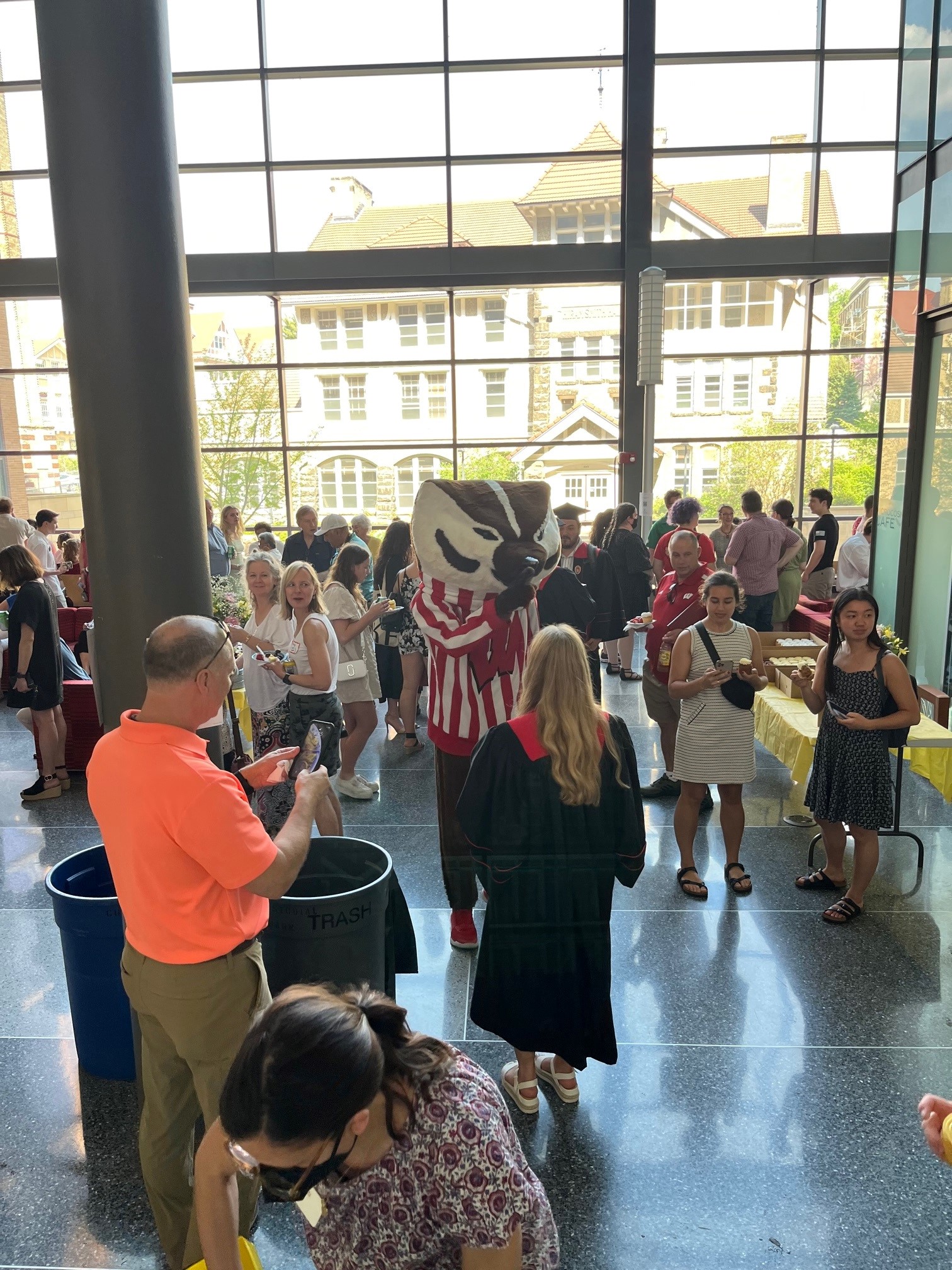 On Friday, May 13, we celebrated the graduation of our first cohort of Global Health majors (n=37) with families and friends at a ceremony in Ebling Hall. Dr. Jonathan Patz, Director of the Global Health Institute, provided words of wisdom, and then each graduate walked across the stage to receive their diploma covers and congratulations. After the ceremony, we all adjourned to a reception where students graduating with a Certificate in Global Health joined us. A highlight of the afternoon was the appearance of Bucky Badger (many photos were taken). Thanks to the GH advising team, Dr. Todd Courtenay, Devika Suri, and Megan Juneau, for organizing this special day.