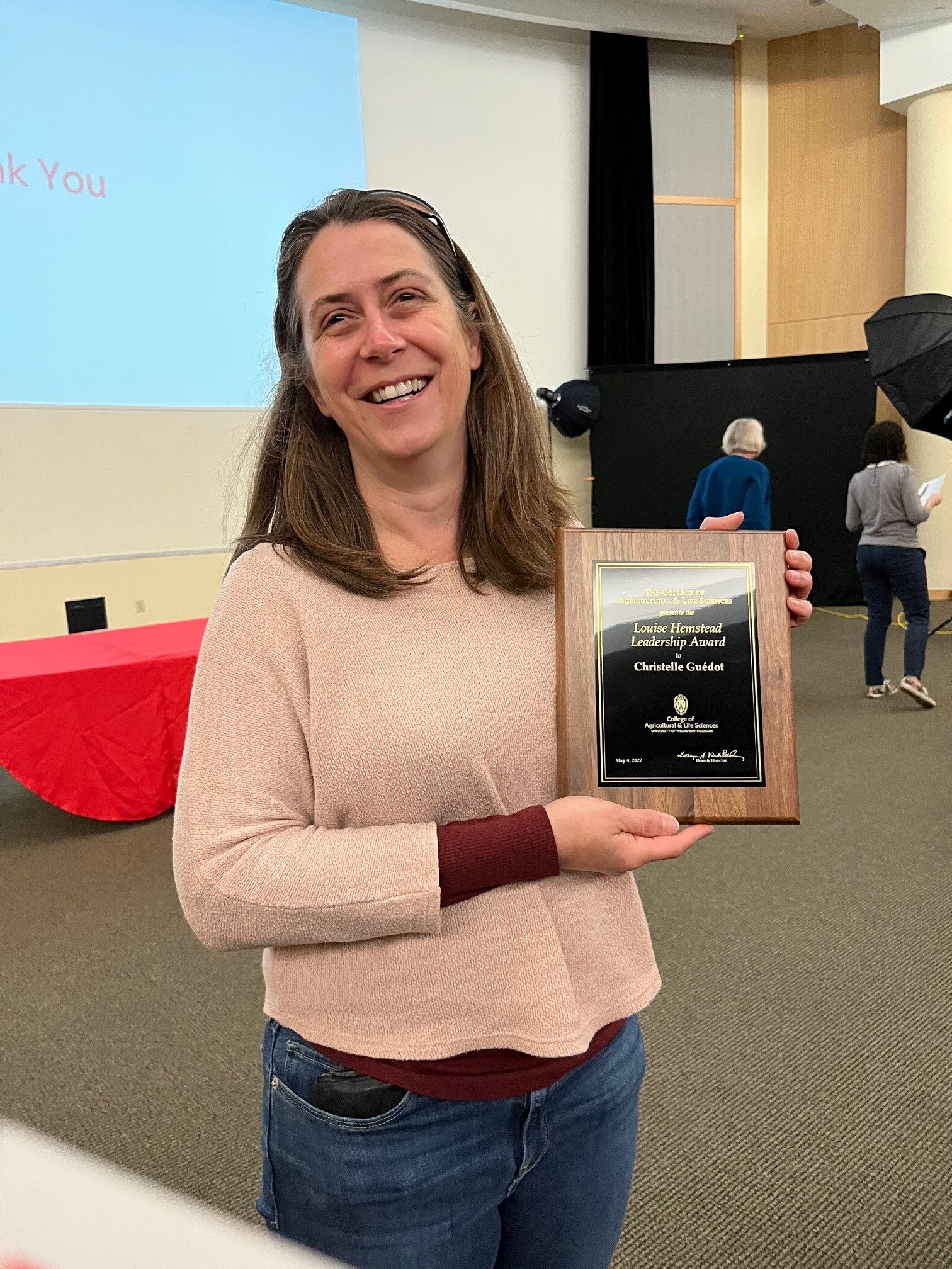 Dr. Christelle Guedot, Associate Professor and Extension Fruit Crops Entomologist in the Department, was recently selected to receive the 2022 Louise Hemstead Leadership Award, which was established in 2018 and is given annually to a CALS faculty or staff member. Organic Valley announced the creation of this new college award named in honor of alumna Louise Hemstead, Meat and Animal Science BS’82, and acknowledging Hemstead’s pioneering work in dairy science and dairy business.