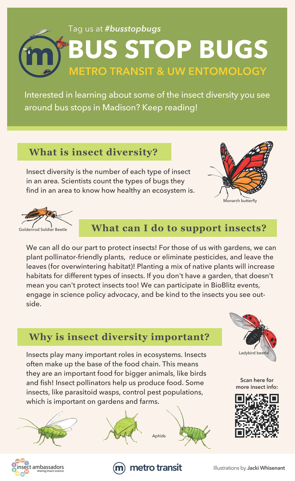 This summer Insect Ambassadors is partnering with Madison Metro to bring insect outreach to the streets with Bus Stop Bugs! Find posters with insect info around town. Stops with posters include: Gorham at Blair (Park), W Wash at Brittingham (Park), Monroe at Leonard (Edgewood), Speedway at Glenway (golf course), Atwood at Walter/ Atwood at Cottage Grove (park), Division at Oakridge (near lake), Jenifer at Paterson (near lake/park), Commercial at Packers (park), Northport at Warner (park), Sheboygan at State Office, Mineral Point at Rosa (park). Thanks to Jacki Whisenant for designing these beautiful posters (see image, right)!