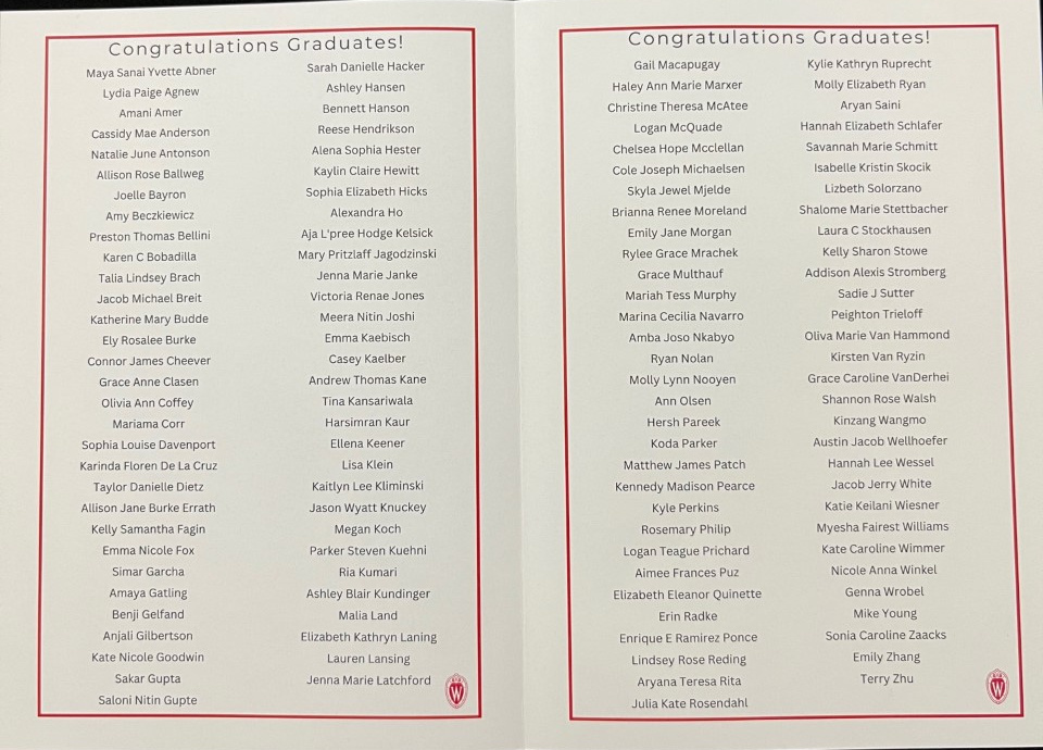 The new Global Health undergraduate major celebrated its 2023 class with an event hosted by Dr. Susan Paskewitz, Dr. Patrick Remington, Todd Courtenay, Megan Juneau, and Kelcey Daniels. This major continues to impress with growing enrollment and quality graduates. Some photos of the event are shown below. Congratulations to all!